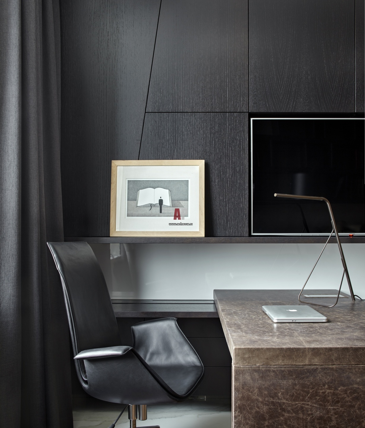 Кабинет в темных тонах с кожаным столом и диваном – одно из пожеланий заказчика. Рабочий стол в кожаной отделке оснащен электроприводом. У него есть направляющие (по которым он ездит) и электрический блок.