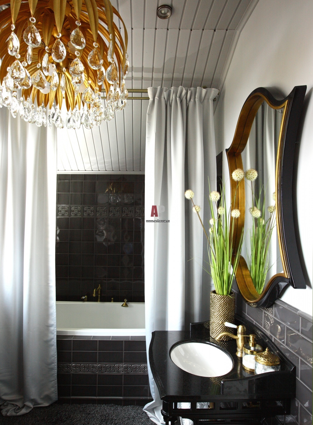Интерьер ванной комнаты при хозяйской спальне. Золотая стеклянная люстра, Lucienne Monique . Сантехника, Migliore.