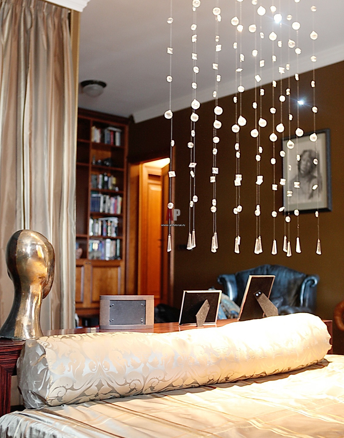 Хозяйская спальня выполнена в современной стилистике. Кровать зонирована ниспадающими с потолка нитями с бусинами, которые сияют на свету.