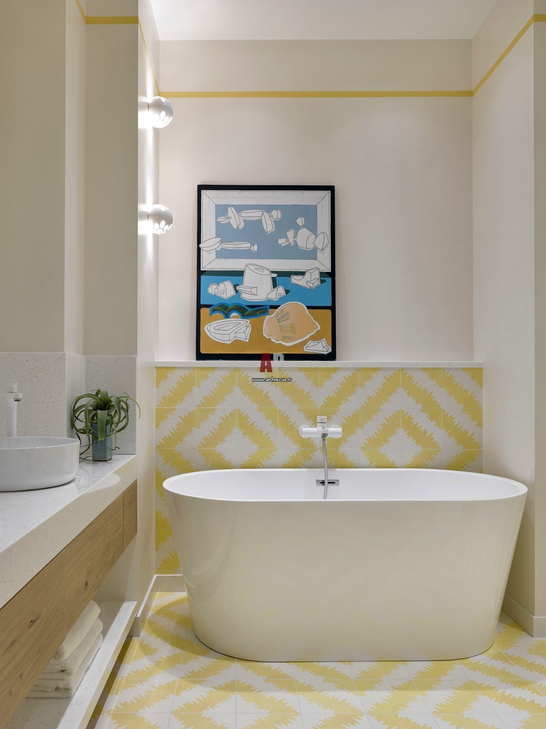 Детская ванная комната выполнена в солнечной палитре. Пол и нижний фронт стены за ванной облицованы цементной плиткой, Luxemix. Стены частично покрашены глиняной краской. Ванна и раковины, Laufen. Смесители c аэраторами, Grohe.