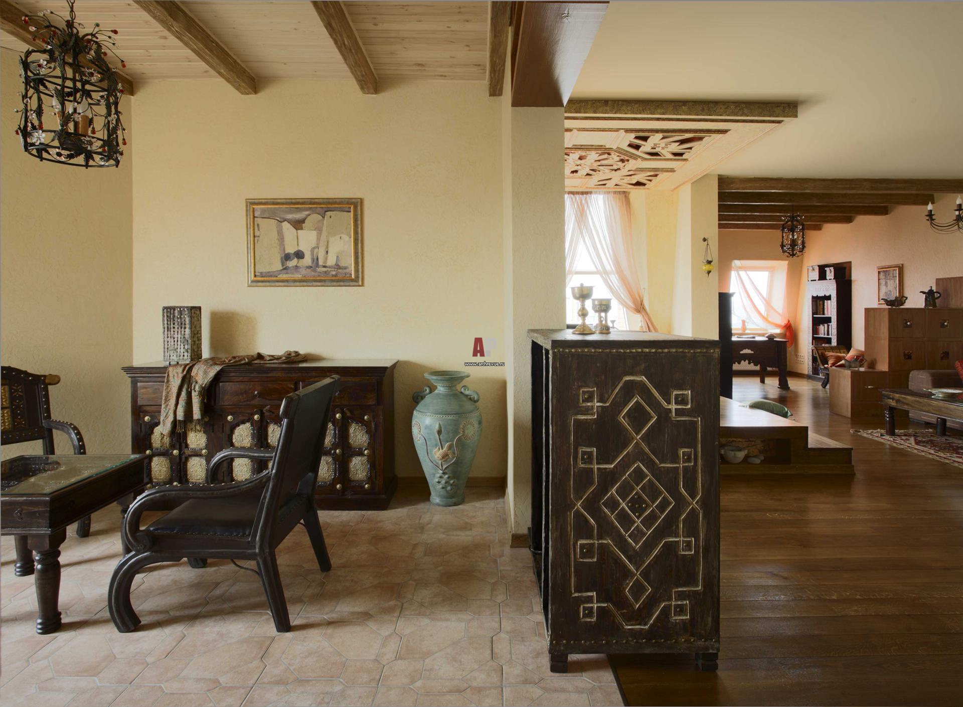 Пол общественной зоны выложен массивной дубовой доской TopWood, поставщик «Дом паркета». Мокрые зоны облицованы керамогранитом Emigres, поставщик «Галионн». Он напоминает раскладку полов в восточных жилищах и имитирует фактуру клинкера.