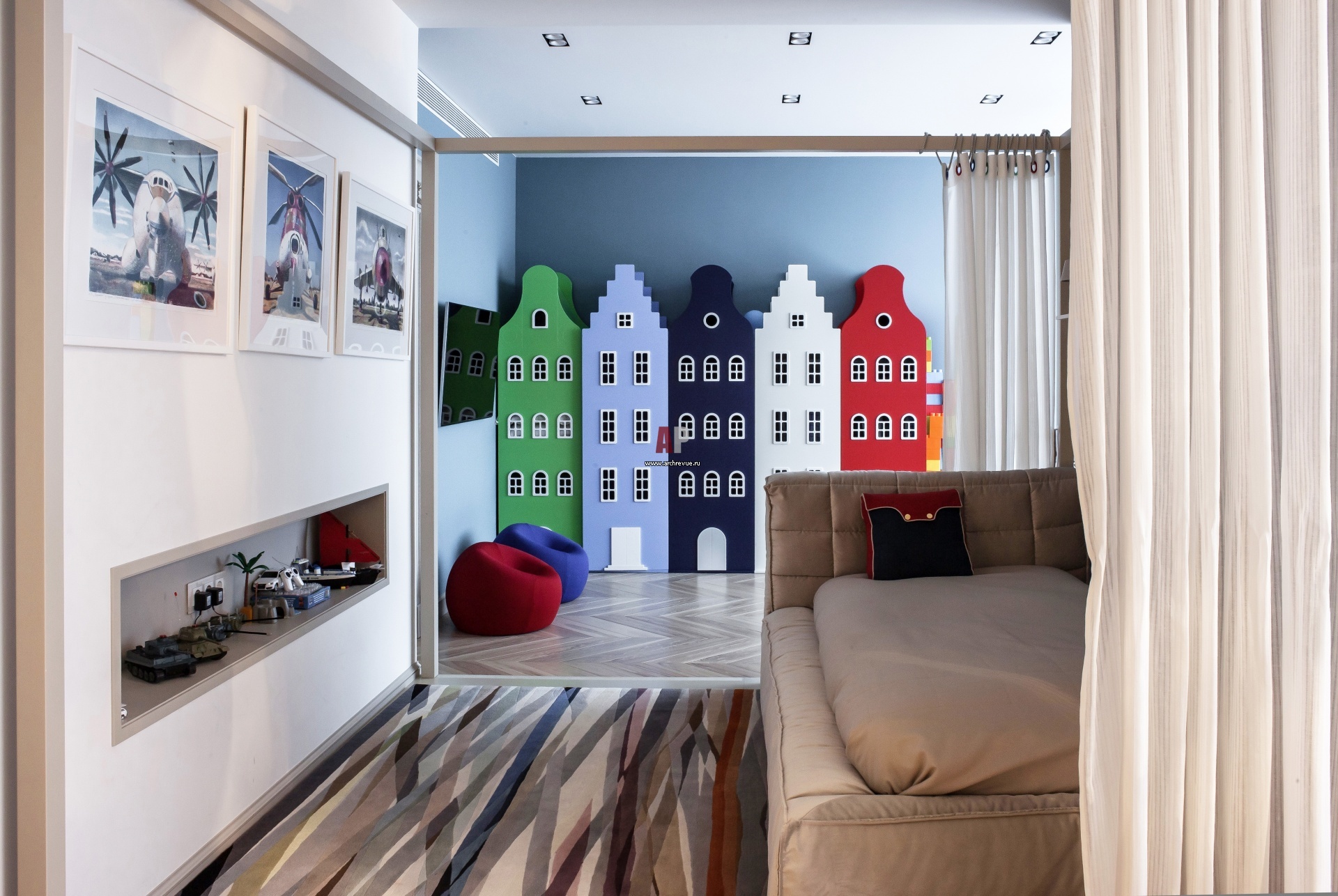 Интерьер детской игровой в большой семейной квартире. Домики-шкафы, Kast van een Huis. Встроенная мебель, стеллажи, шкафы, на заказ, изготовление «АФ Ника».