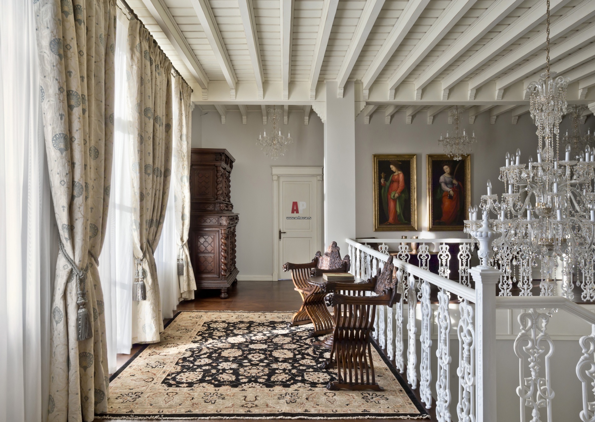 Зона отдыха в холле второго этажа. Потолок оформлен деревянными балками, выкрашенными в белый цвет. Ковер-чуби ручной работы. Кресла «Савонарола», антиквариат, середина XIX века, Италия. Шкаф, XVIII век, Нидерланды.