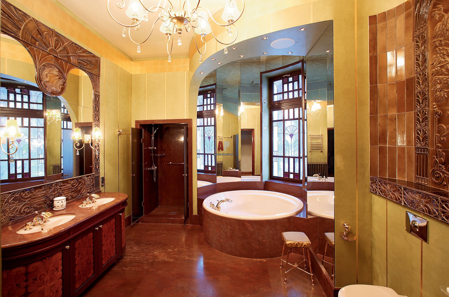 Каждый из 8 санузлов дома выглядит ярко и необычно. Все вместе они вполне могли бы стать иллюстрацией к истории развития стиля ар-деко. Тон в них задает оригинальная сантехника, поставщик «Танит».