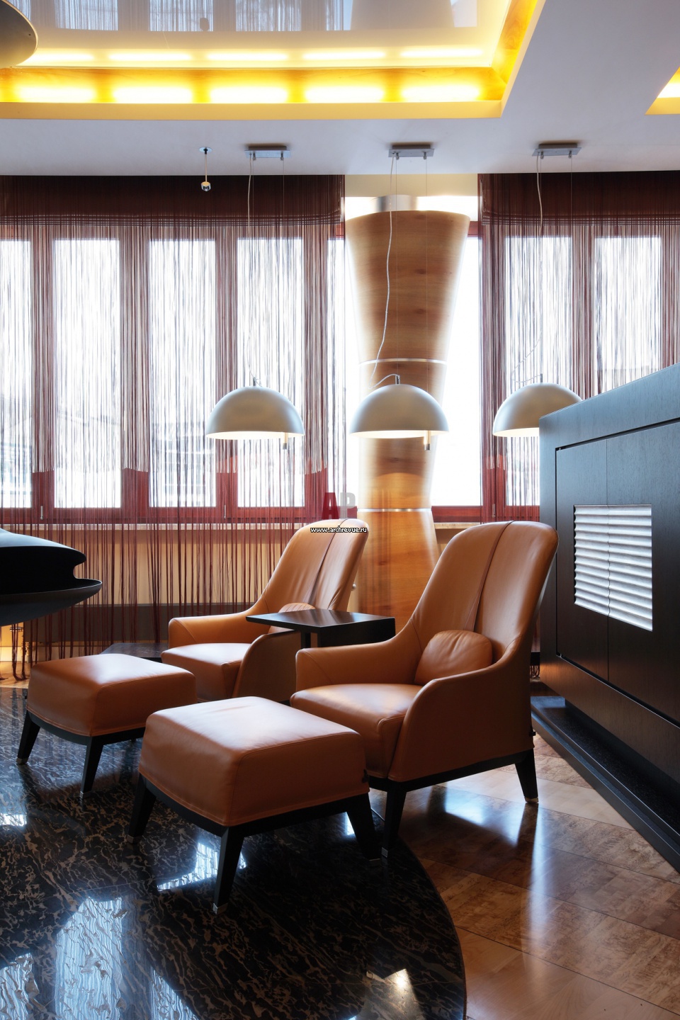 Фрагмент интерьера зоны отдыха. На колоннах между окнами – полукруглые панели. Древесные волокна идут по горизонтали.