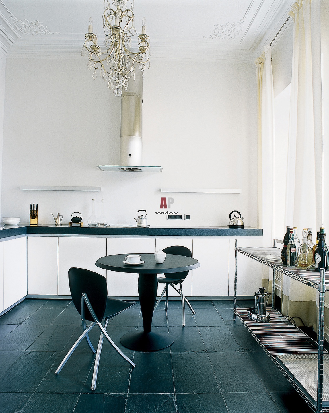 Монохромный интерьер кухни выполнен в современном стиле. Стены и потолок выкрашены белой матовой краской, фасады кухонного гарнитура выполнены в белом глянце. Пол выложен плитами из графитно-черного сланца, этот же камень использовался в отделке столешницы.