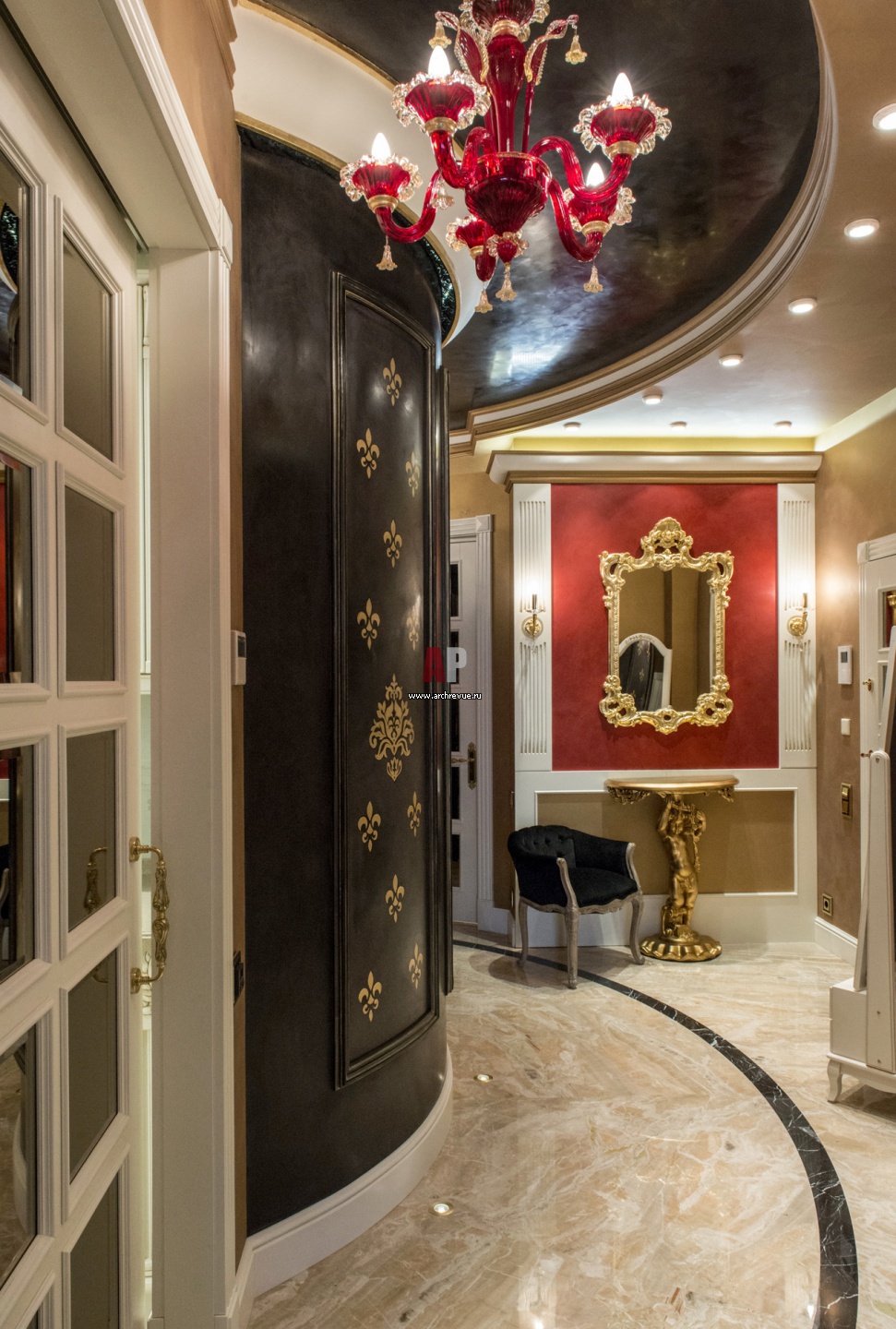 Ядро квартиры – круговой холл, в центре которого в импровизированной ротонде располагается гостевой санузел. Центральный объем оформлен венецианской штукатуркой на основе черного цвета с золотым ручным орнаментом – французская лилия. На полу – слэбы из мрамора сорта Breccia Damascata со вставками из черного мрамора Nero Marquina , поставка, радиусная резка и монтаж Estro.