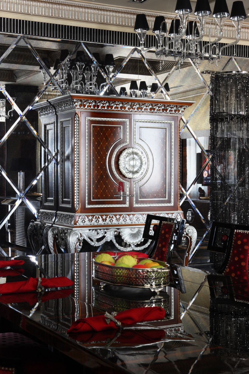 В интерьер использованы материалы с отражающей поверхностью: лакированное дерево, зеркала, полированный камень.