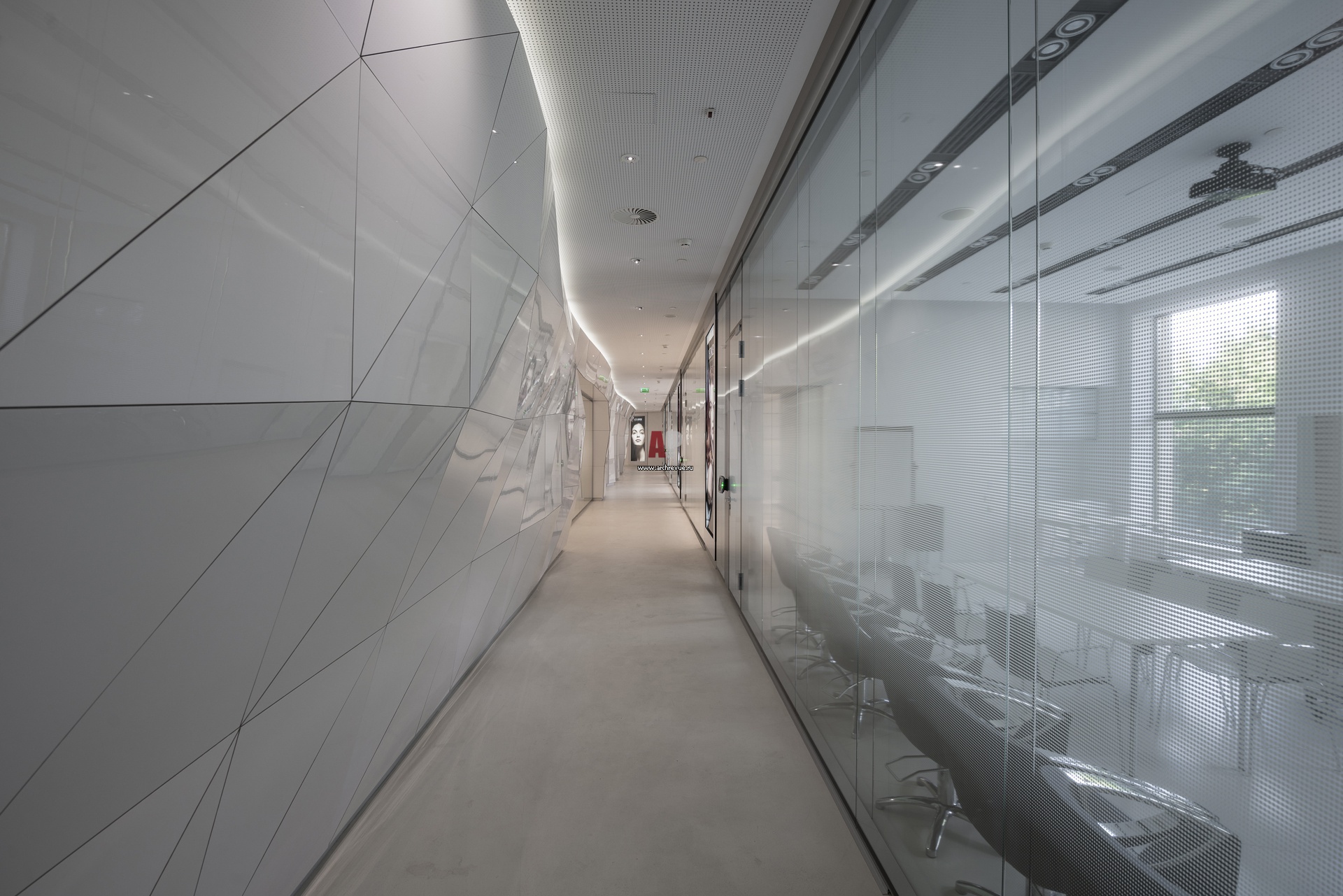 Холл в белой цветовой гамме. За стеклянными перегородками – учебный кабинет.