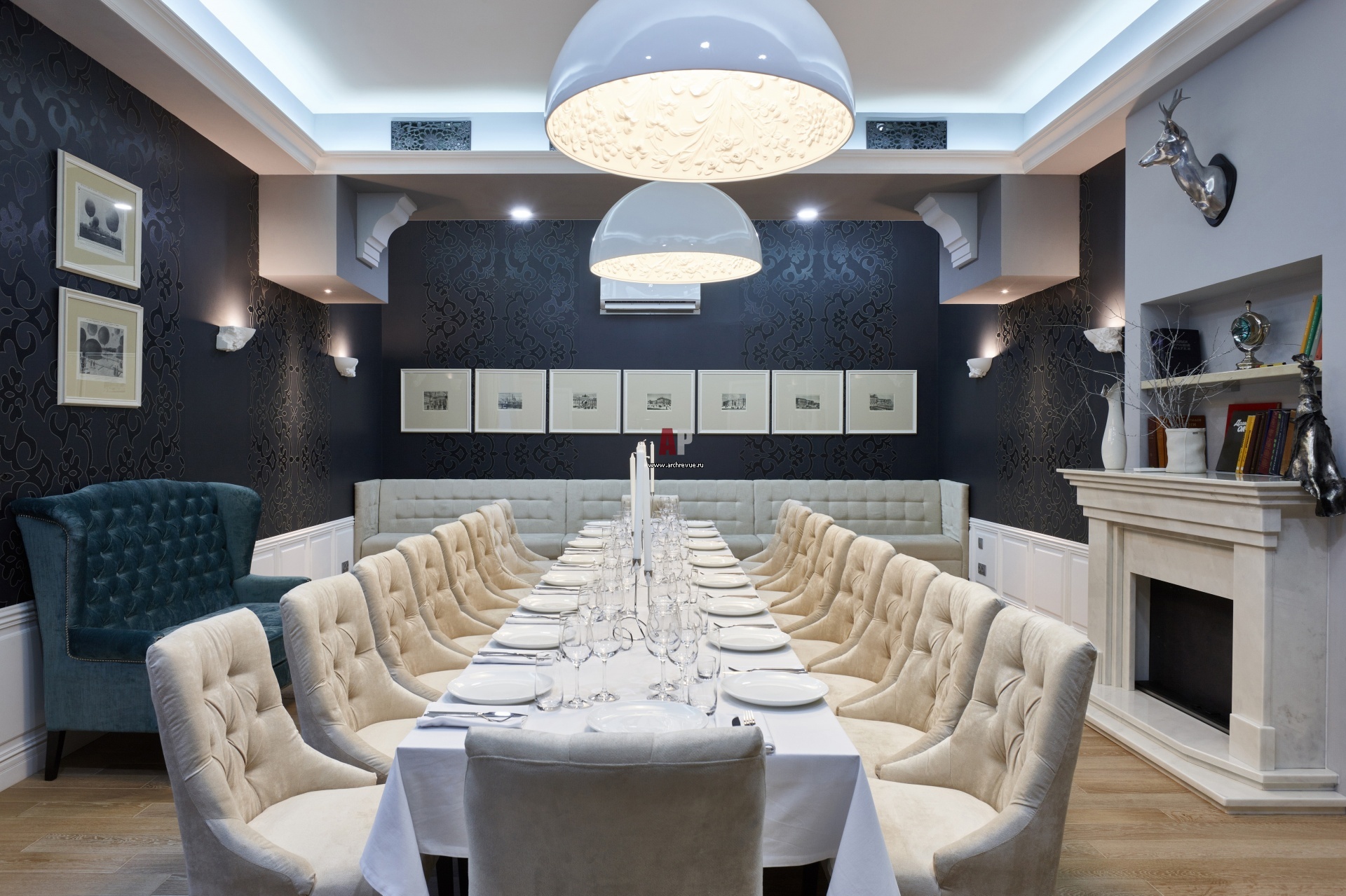 Интерьер банкетного зала с белокаменным камином. Вся мебель в ресторане сделана российскими мастерами в индивидуальном порядке.