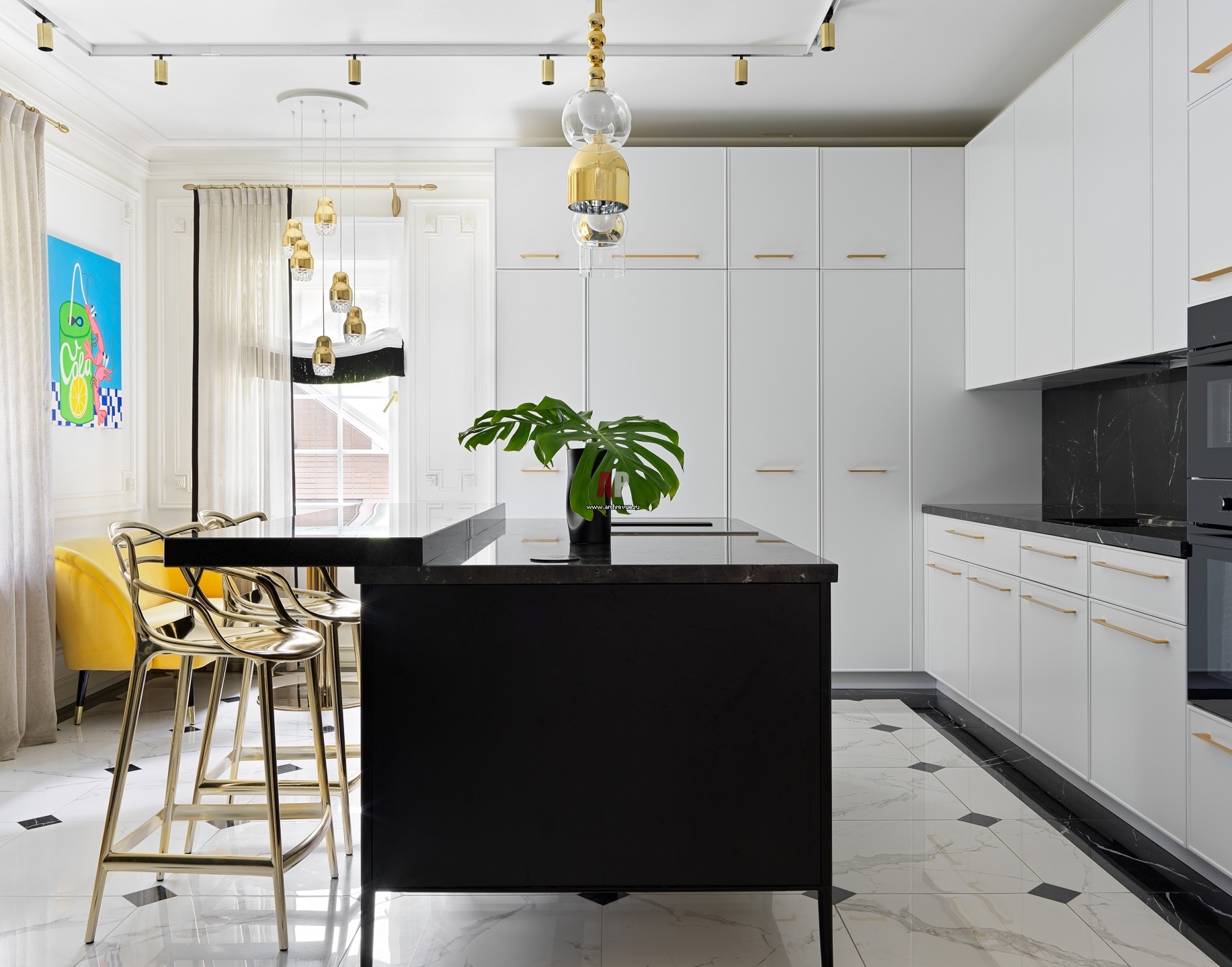 Кухня изолирована от общего пространства. Кухонная мебель, Cesar. Остров стоит на ножках, так что просматривается весь пол и кажется, что мебель парит. Дизайнер доработала остров, прикрепив к нему будто висящую в воздухе столешницу, за которой можно удобно устроиться на невесомых барных стульях Masters от фабрики Kartell дизайна Филлипа Старка.