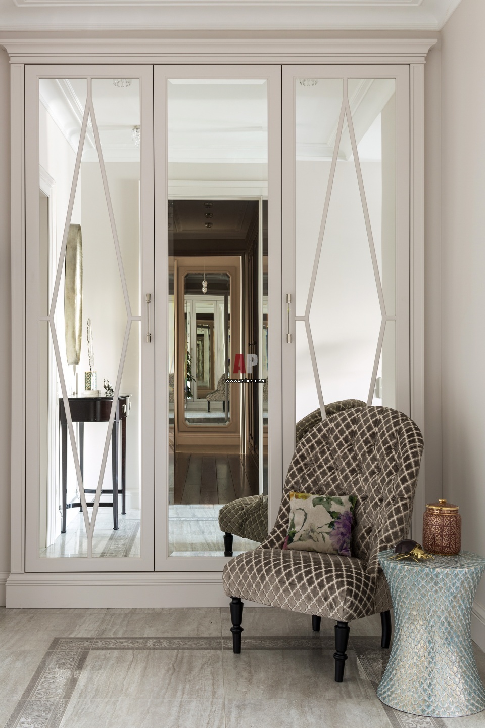 Интерьер прихожей. Двери, шкаф с расстекловкой сделаны на заказ. Краска для стен, Sherwin-Williams, цвет SW 6035. Кресло, Softhouse.