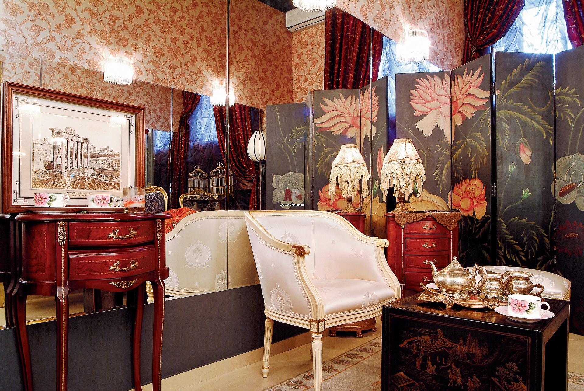 Примерочная комната имеет большую площадь и скорее напоминает будуар светской львицы или грим-уборную театральной дивы начала ХХ века. Романтический облик помещению придают обои в цветочек, поставщик «Ампир Декор». Поверх них по периметру комнаты размещены зеркала.