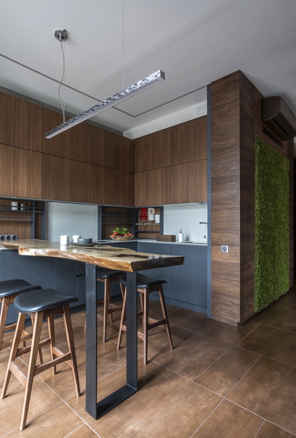 Интерьер изолированной кухни с элементами природного минимализма. Кухонный гарнитур Varenna имеет оригинальную отделку: верхние фасады выполнены из древесины ореха, нижние оформлены черной матовой краской. Стена в прихожей декорирована панно из стабилизированного мха.