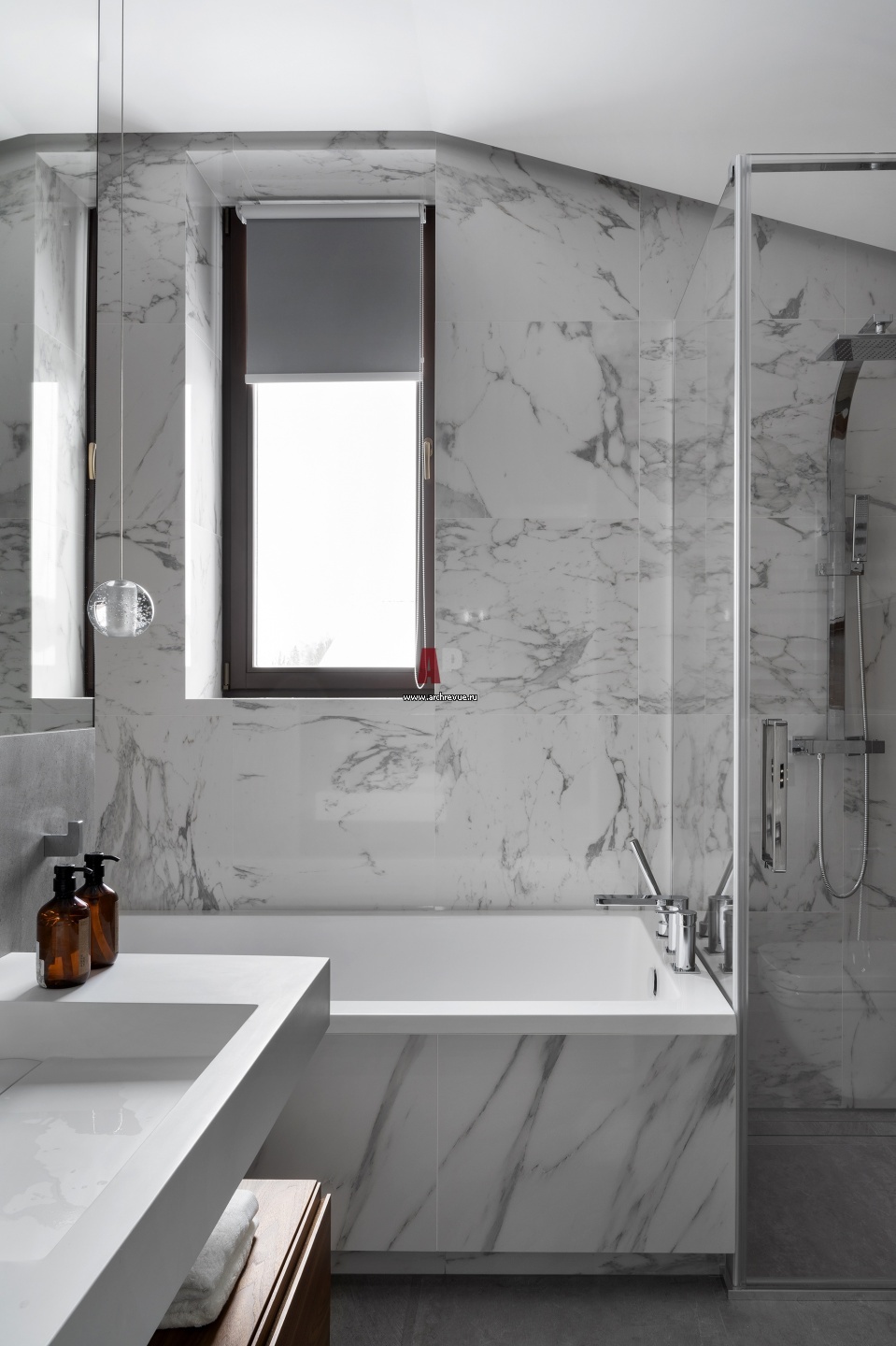 Хозяйский санузел. Под окном размещена ванна. К ней примыкает стеклянная душевая. Керамогранит, перегородки, Porcelanosa. Сантехника, Noken.