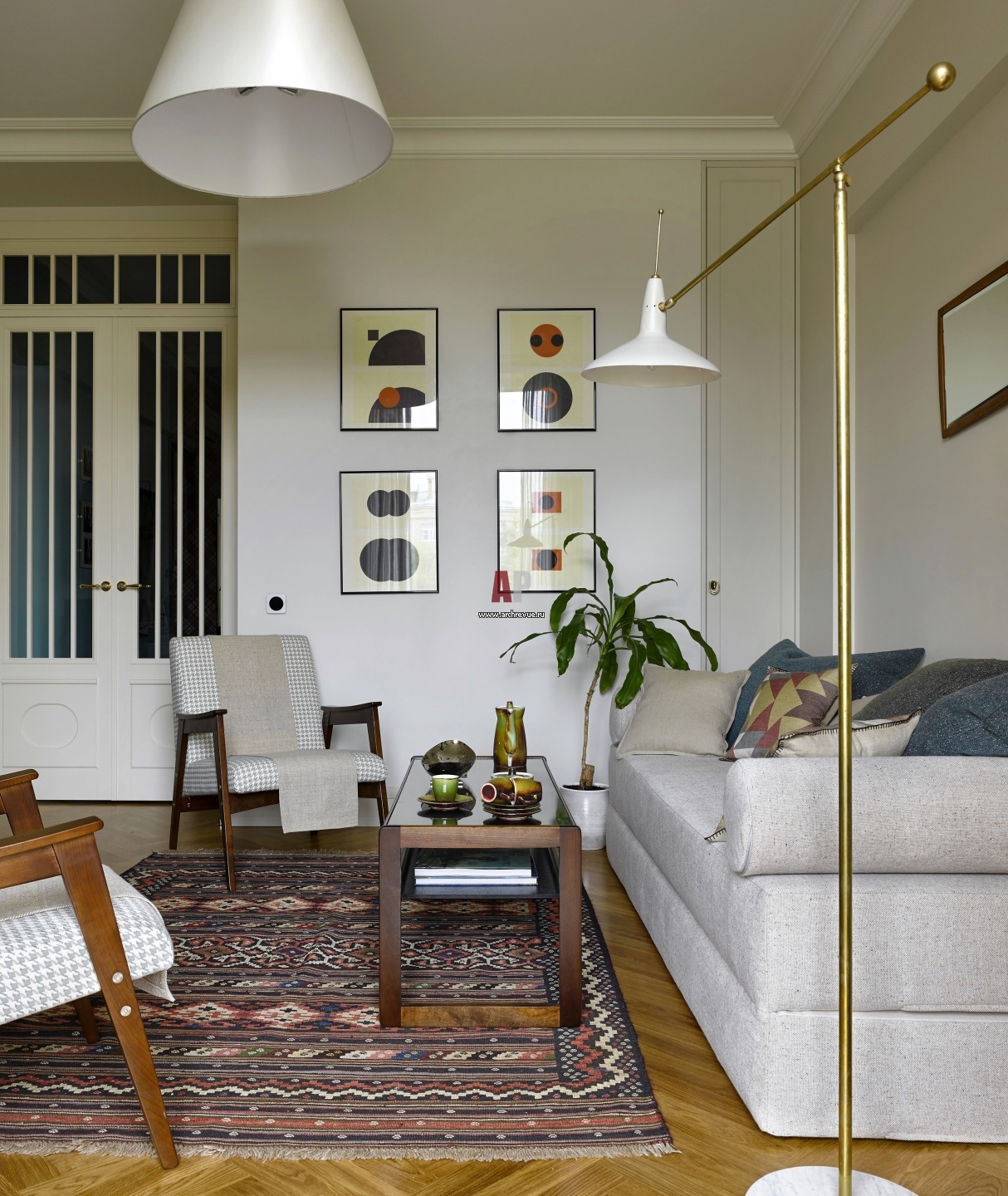 Двустворчатые распашные двери со стеклянными вставками и полупрозрачными шторками сделаны на заказ. Кресла были найдены на «Авито» и тщательно отреставрированы. Столик, винтаж. Стену украшают коллажи Александра Джикии.