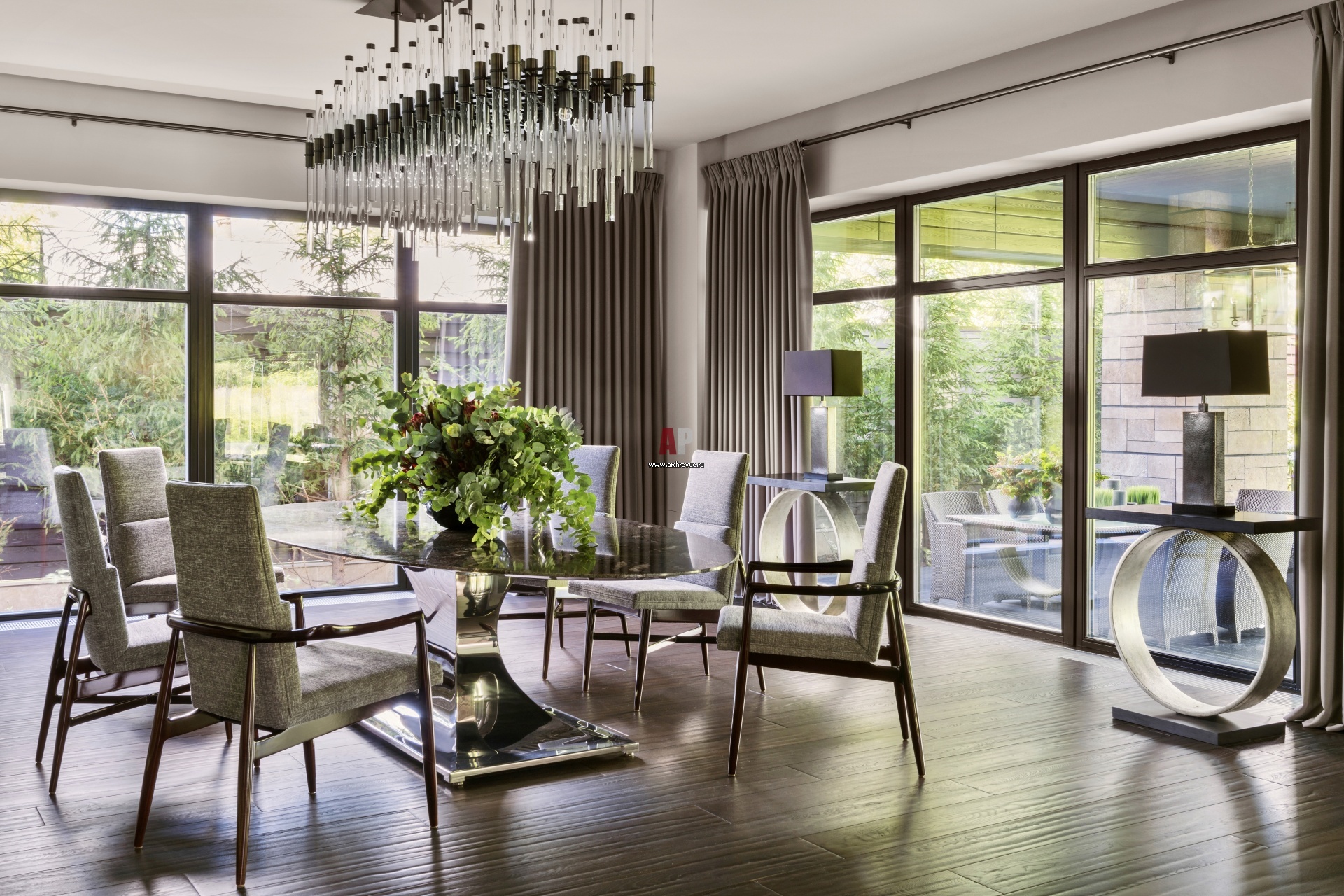 К зоне отдыха примыкает парадная столовая, две стены в ней – полностью стеклянные, и можно выйти на открытую террасу с уличной мебелью.