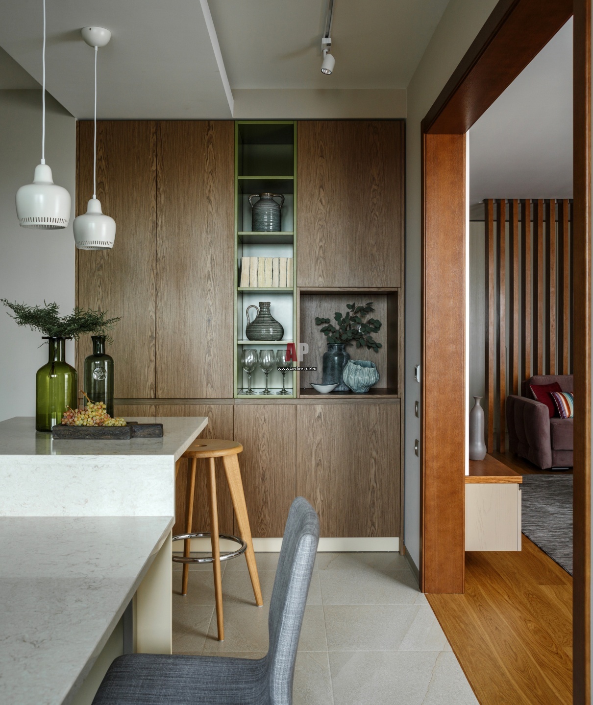Встроенный кухонный гарнитур Virs. Торцы и задник центрального шкафа отделан зеленым цветом, он рифмуется с отделкой мебели и цветом текстиля в гостиной.