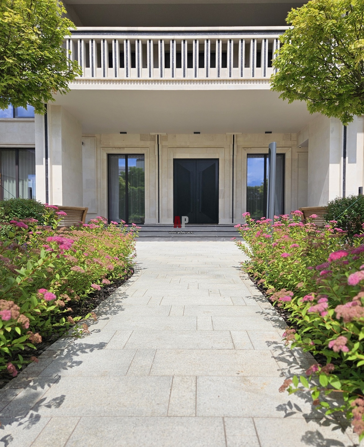 Многоуровневый сад непрерывной декоративности. Ко входу в дом ведет парадная мощеная дорожка, обрамленная цветниками и кустарниками.