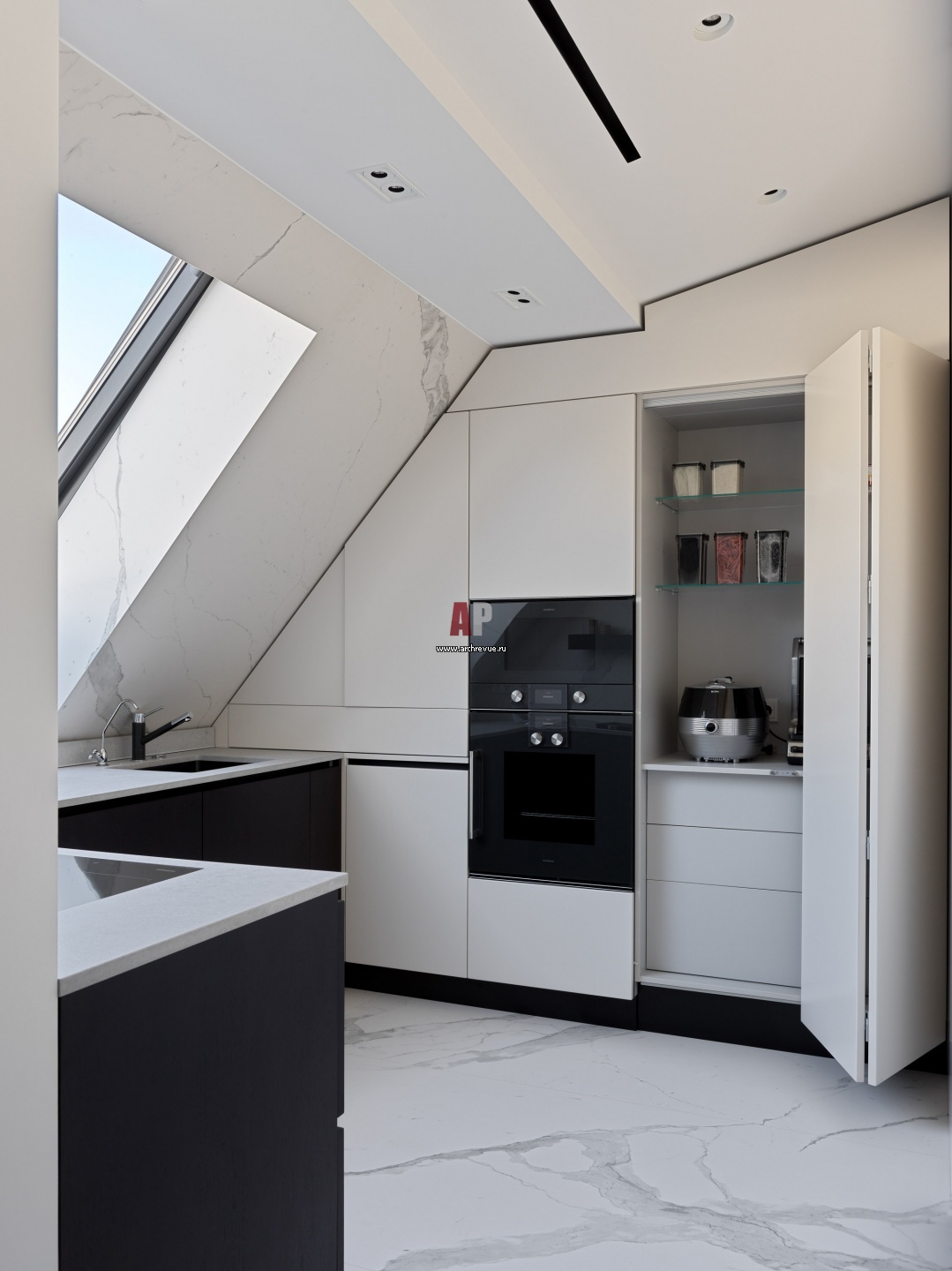 Кухня сделана на заказ. Шкафы размещены под скосом кровли. Высокое качество исполнения обеспечивает идеальное примыкание встроенных элементов и открывание шкафов.