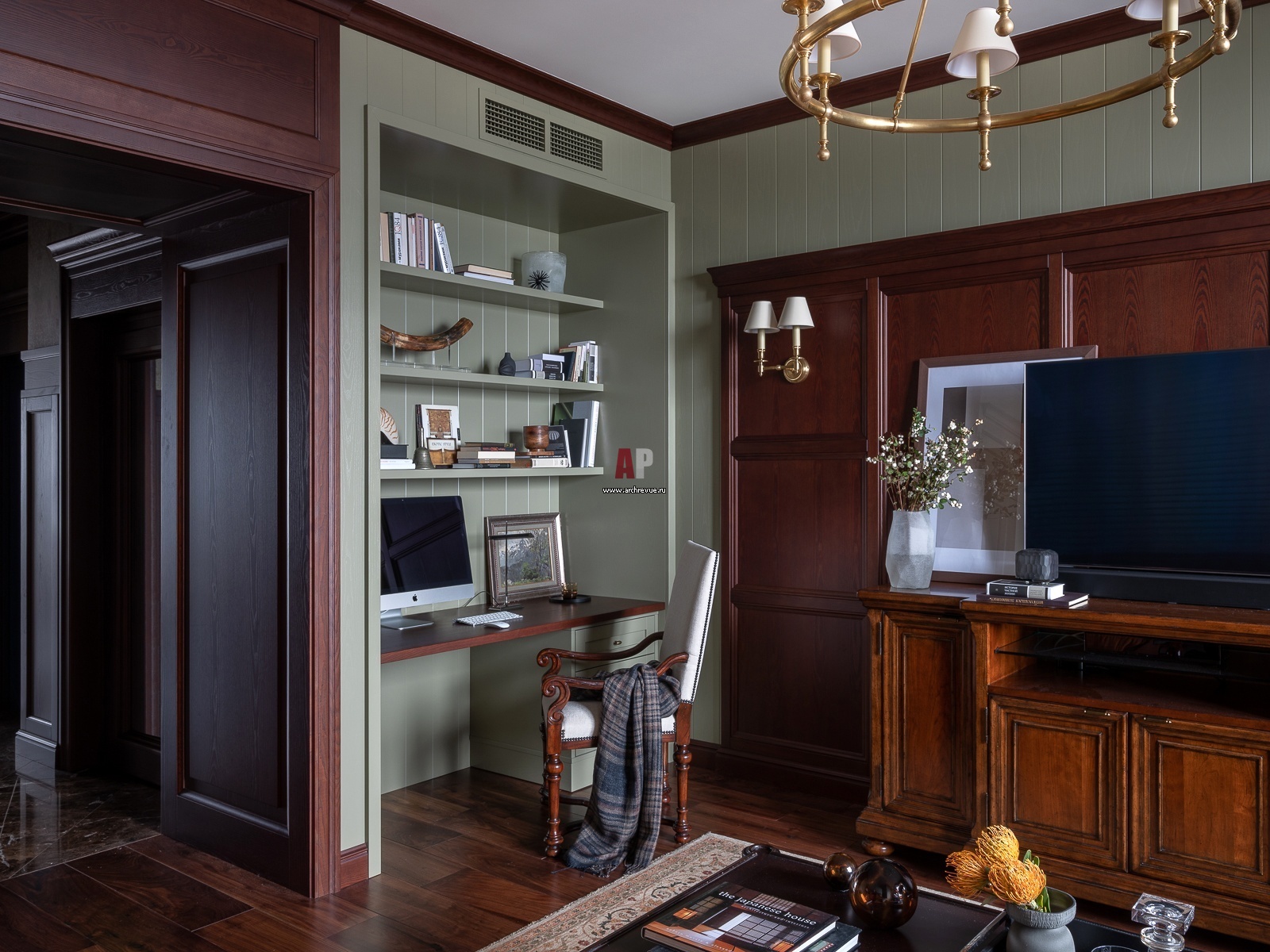 Хозяину не был нужен отдельный кабинет, поэтому компактная рабочая зона интегрирована в общую гостиную. Кресло, Theodore Alexander. Тумба под ТВ, Lexington.