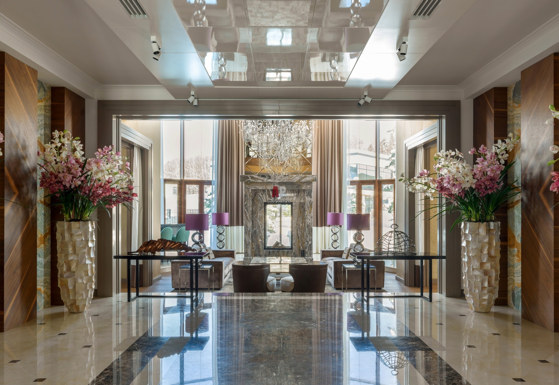 Эклектичный особняк в Подмосковье. Парадный холл. Цветы в напольных вазах, Menno Kroon.