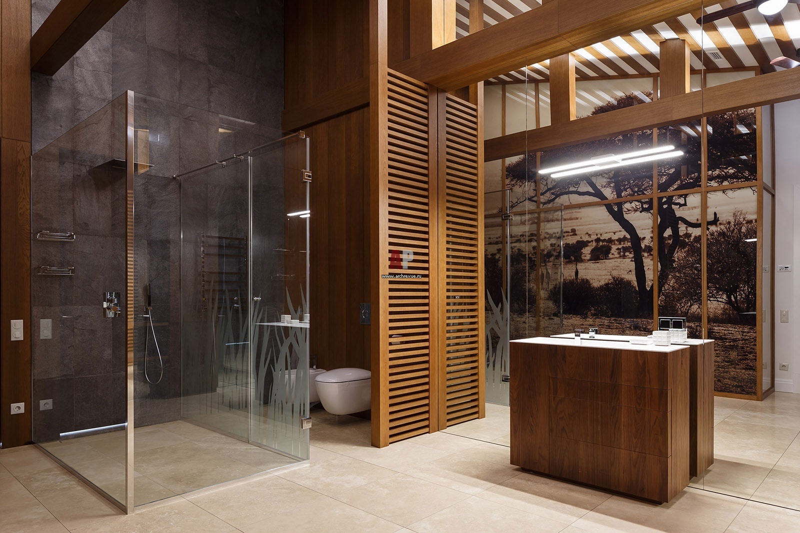 Мужская ванная отделана тиком, как бунгало на океанском острове. Мебель Milldue. На стене принт с пейзажем саванны.