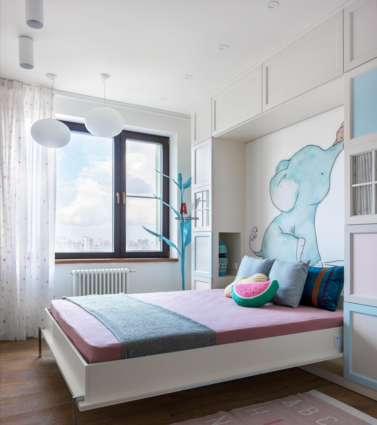 Интерьер детской в семейной квартире. Кровать в шкафу сделана на заказ.