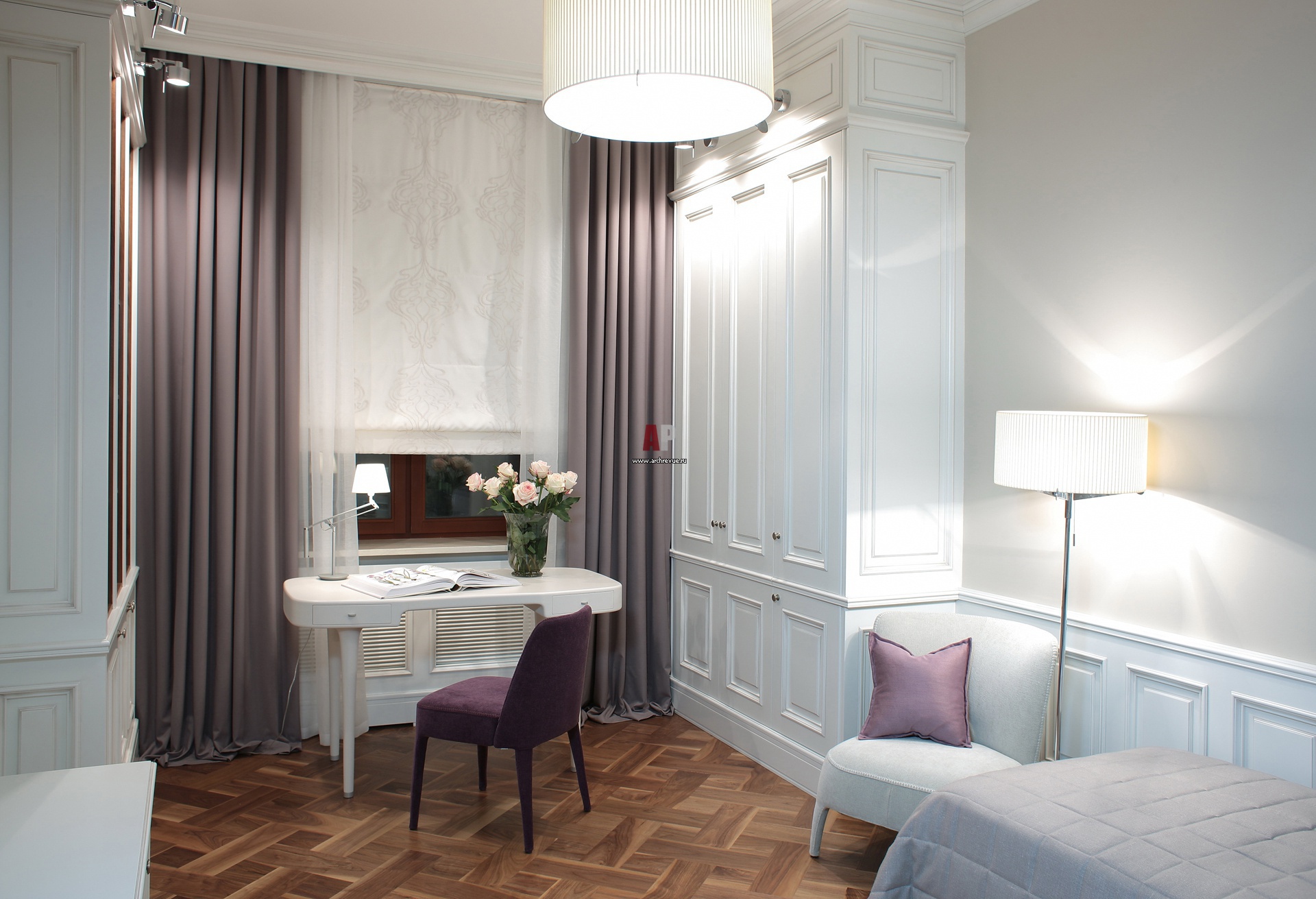 Детская комната выдержана в белых тонах с вкраплениями лилового. Высокие шкафы, буазери, на заказ изготовление «АФ Ника». Паркет уложен классической плетенкой, рисунок набран из широких плашек, что придает интерьеру современный вид.