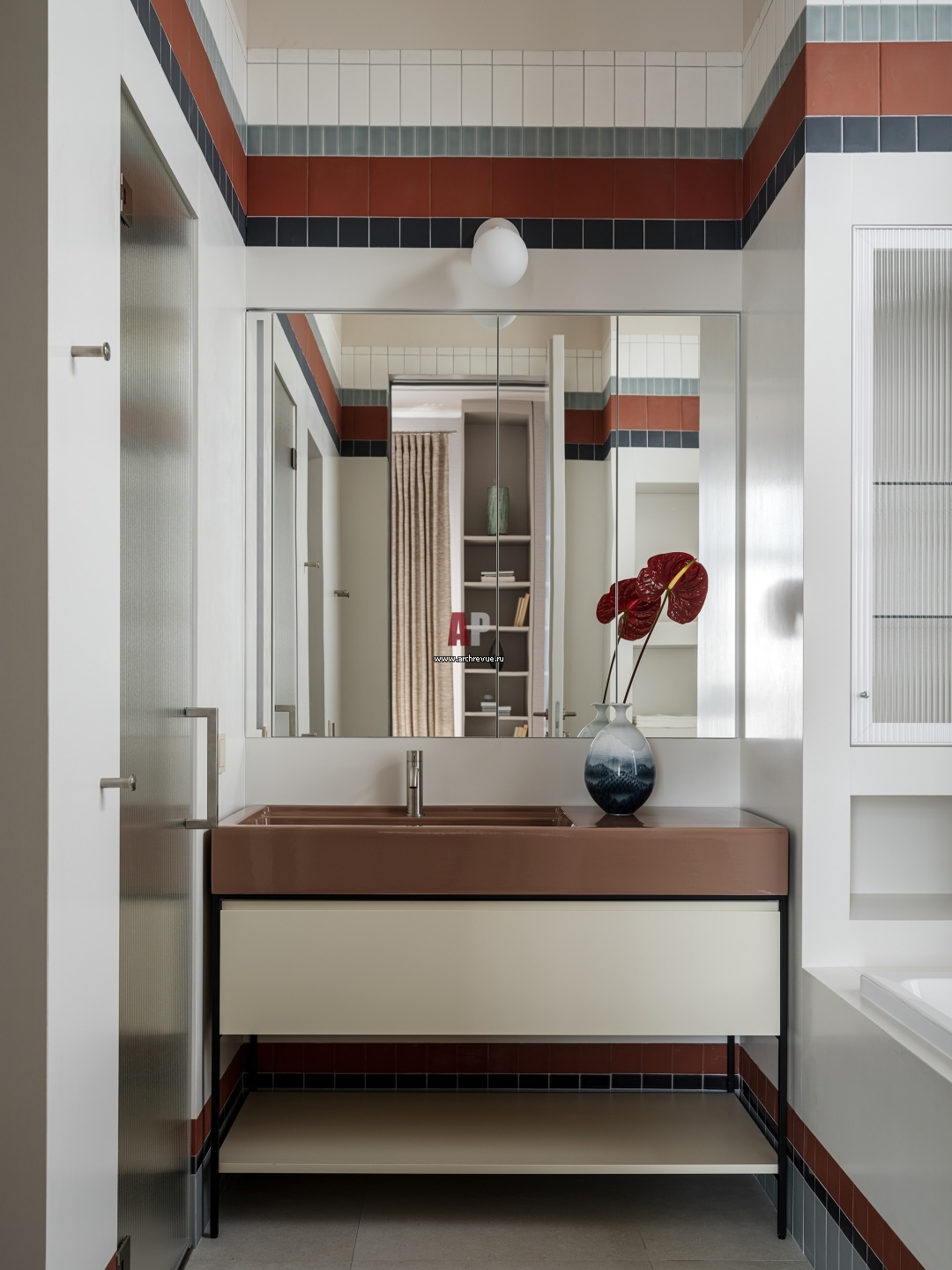 Санузел при комнате дочери. Пол – керамогранит, FAP, Nux. Стены – керамогранит, Arch-Skin. Плитка цветная, Mutina, Din. Бра, Areti, Cone and Sphere.