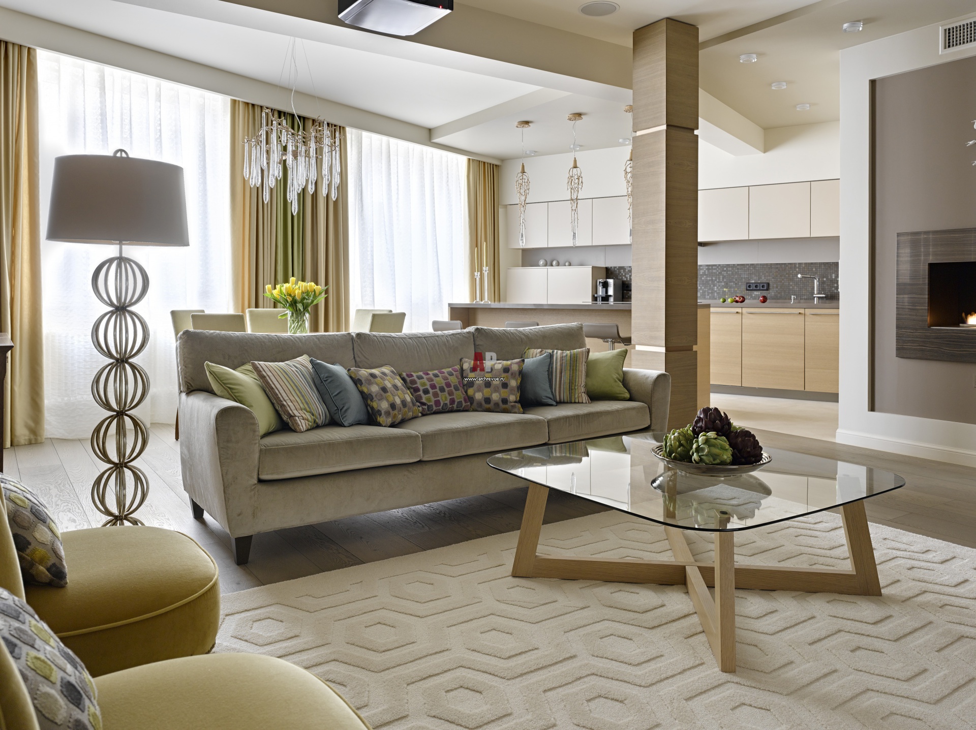 Гостиная-кухня является акцентным помещением в квартире, в ней располагается домашний кинотеатр, встроенный камин, кухонная мебель и обеденный стол. Диваны, комоды, Neue Wiener Werkstatte. Кресла, Galimberti Nino. Журнальный стол, BoConcept.