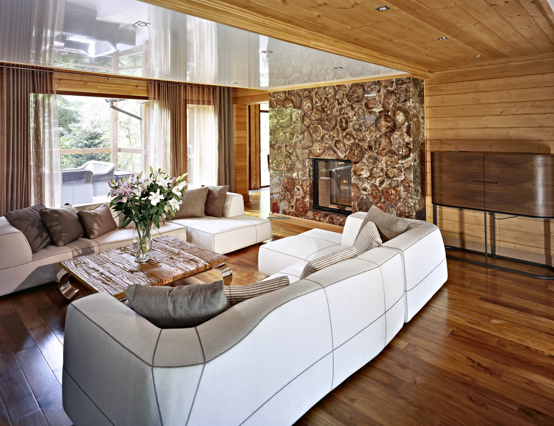 Зона камина оформлено панно из горизонтальных спилов окаменевших деревьев, которым более пяти миллионов лет. Производитель – Antolini.