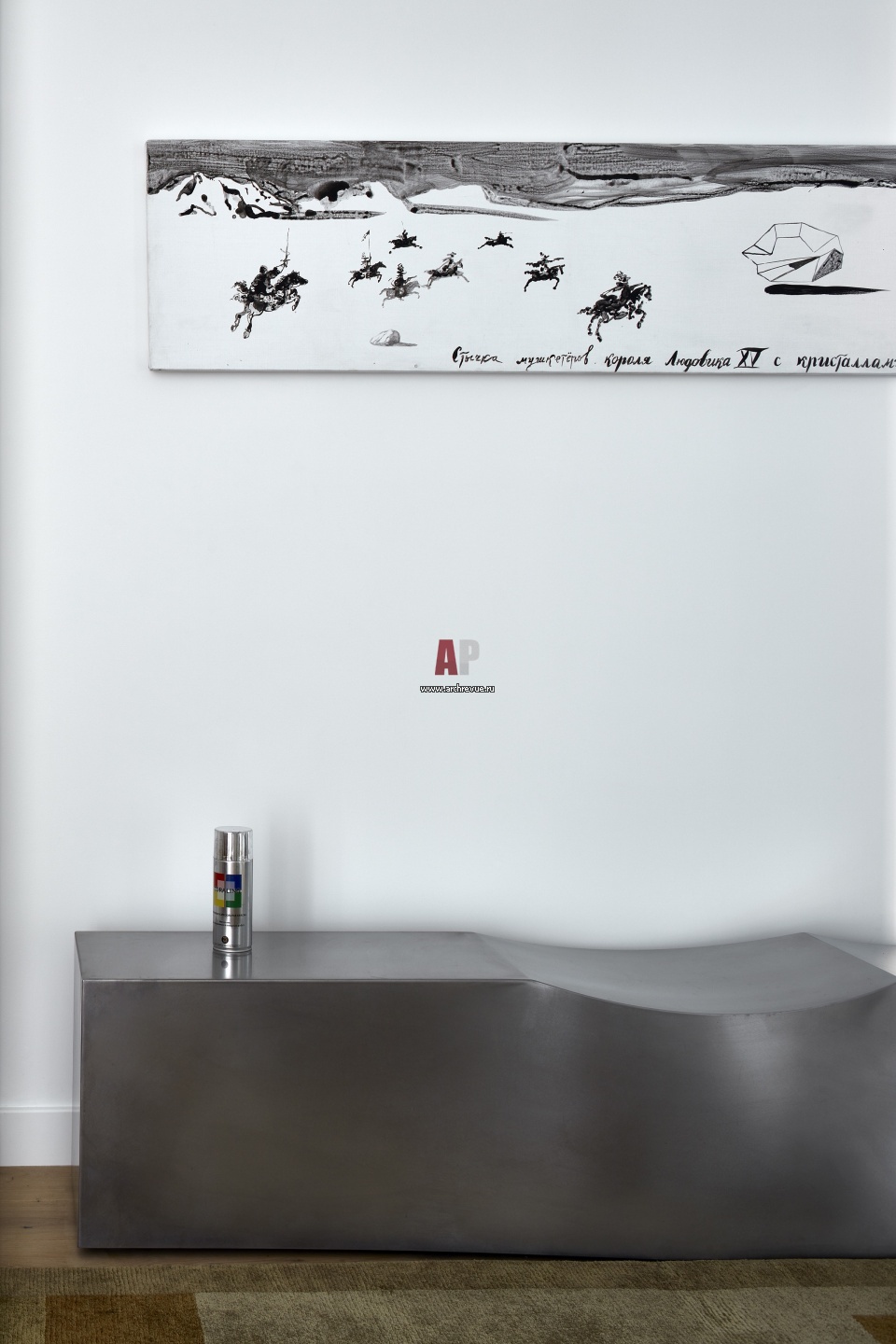 Фрагмент прихожей. Металлическая скамейка, B&B Italia, модель Double Dip. На стене – работа Павла Пепперштейна Стычка мушкетеров короля Людовика XV с кристаллами группы H-14».