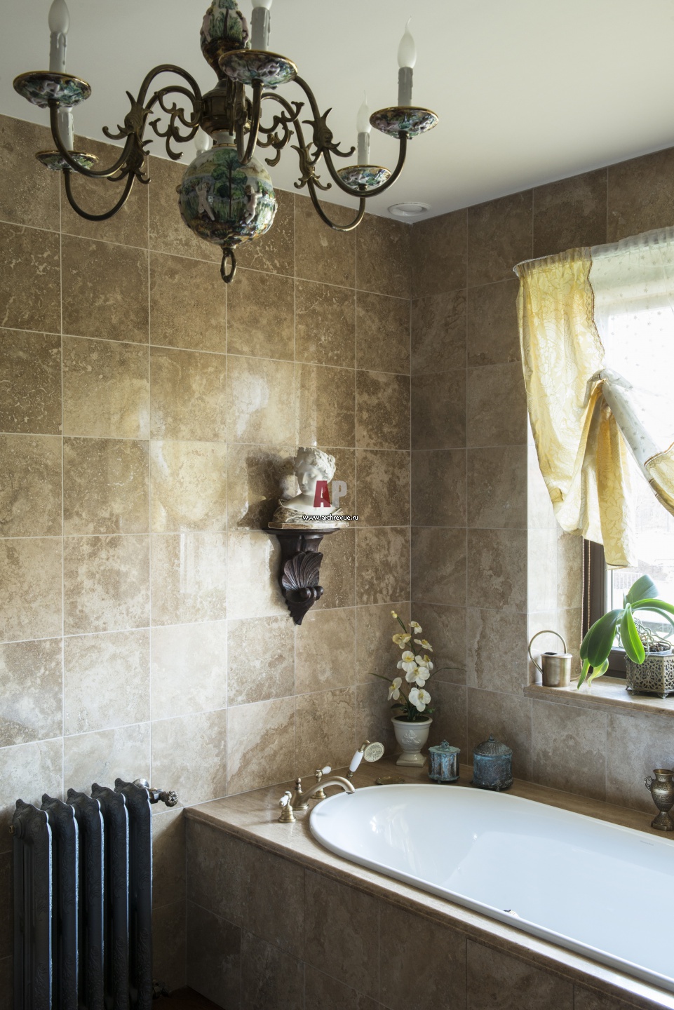 Ванная расположена возле окна. Стены, ботики ванны, подоконники выполнены из травертина.
