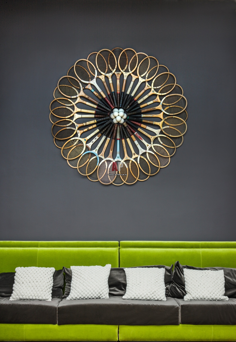 Интерьер зала ресторан в духе поп-арт. Декоративное панно из теннисных ракеток. Диваны цвета сочной зелени.