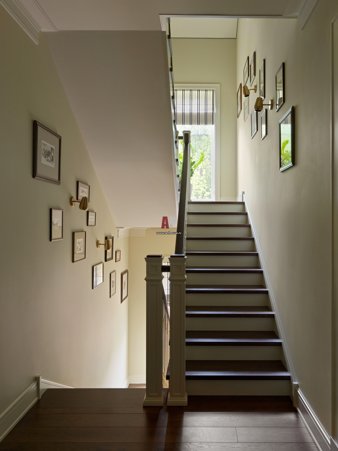 Лестничный холл с традиционным дизайном. Ступени и перила – деревянные.