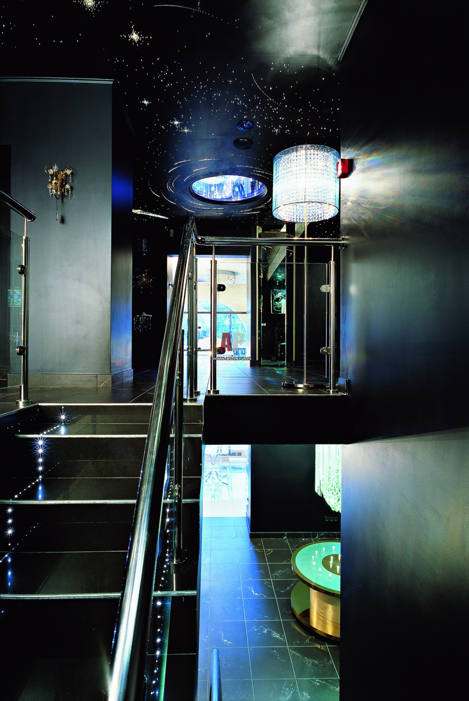 В черных блестящих ступенях лестницы отражается потолочное световое панно Swarovski.