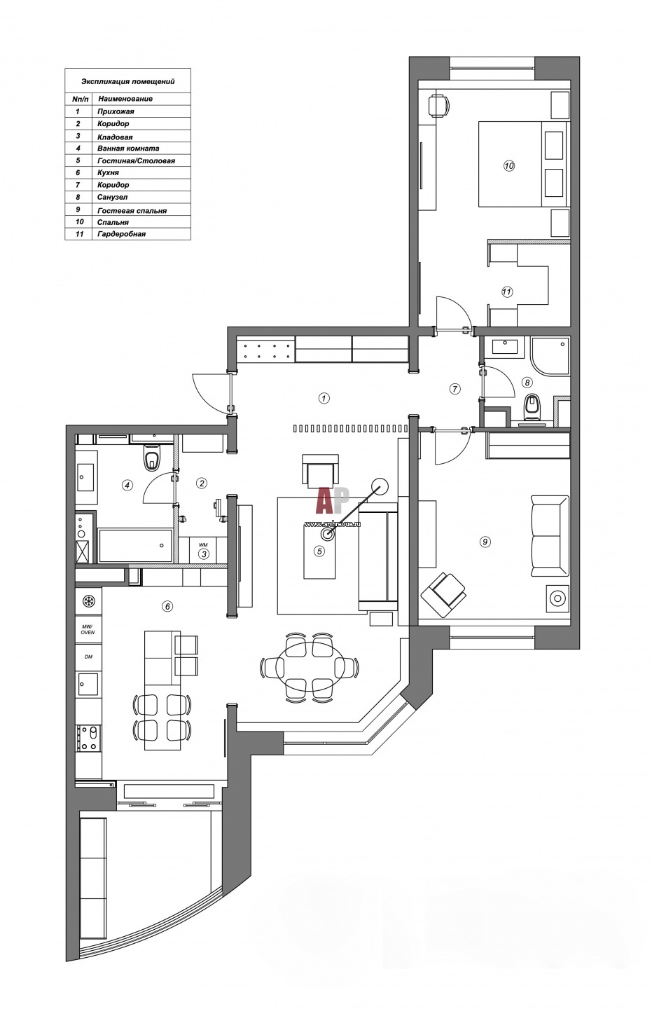 План квартиры с расстановкой мебели для молодой семьи в монолитной новостройке. Общая площадь – 90 кв. м.