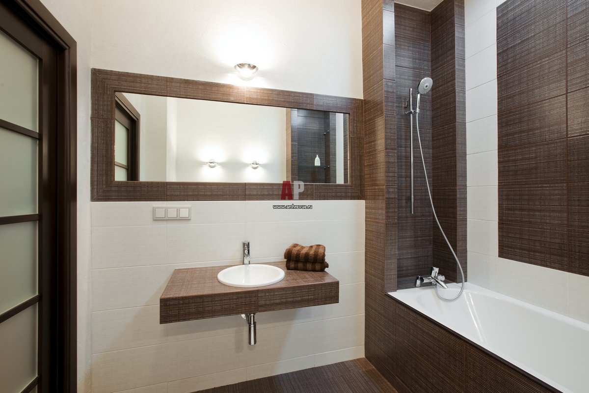 Хозяйская ванная облицована плиткой, имитирующей венге, поставщик «Джиель». Ею отделаны не только стены, но и столешница раковины и ниша, куда вмонтирована ванна.