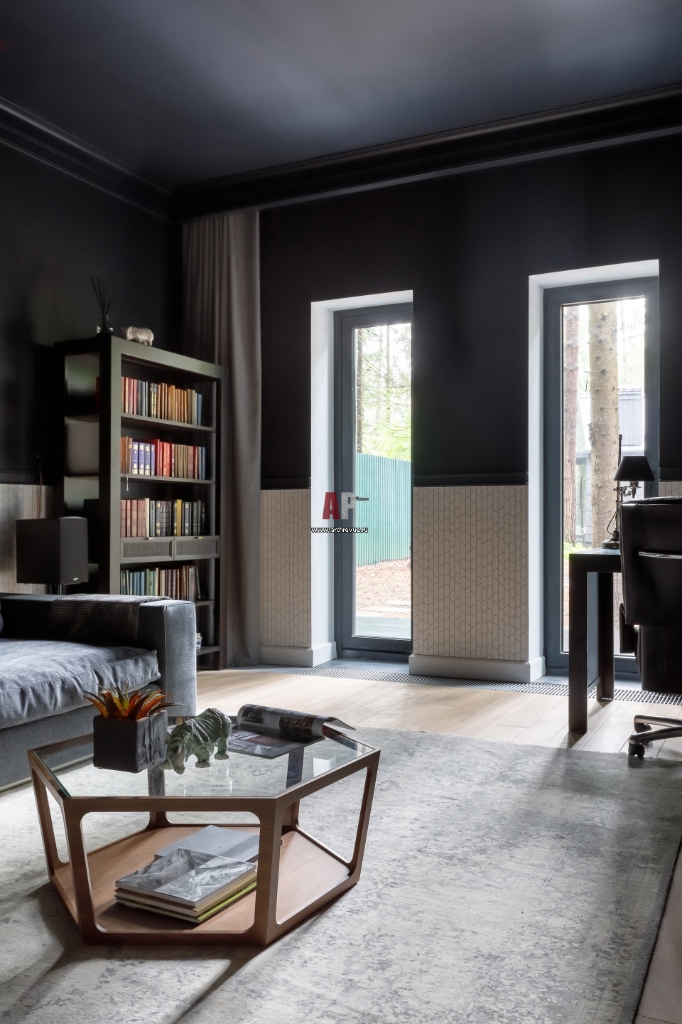 Кабинет с функцией домашнего кинотеатра находится на первом этаже. Он имеет отдельный выход на улицу. Диван, Flexform. Стеллаж, Bamax. Стол массив ореха. Стены и потолок выкрашены краской Paint & Paper Library, оттенок Mono Chrome Paint.