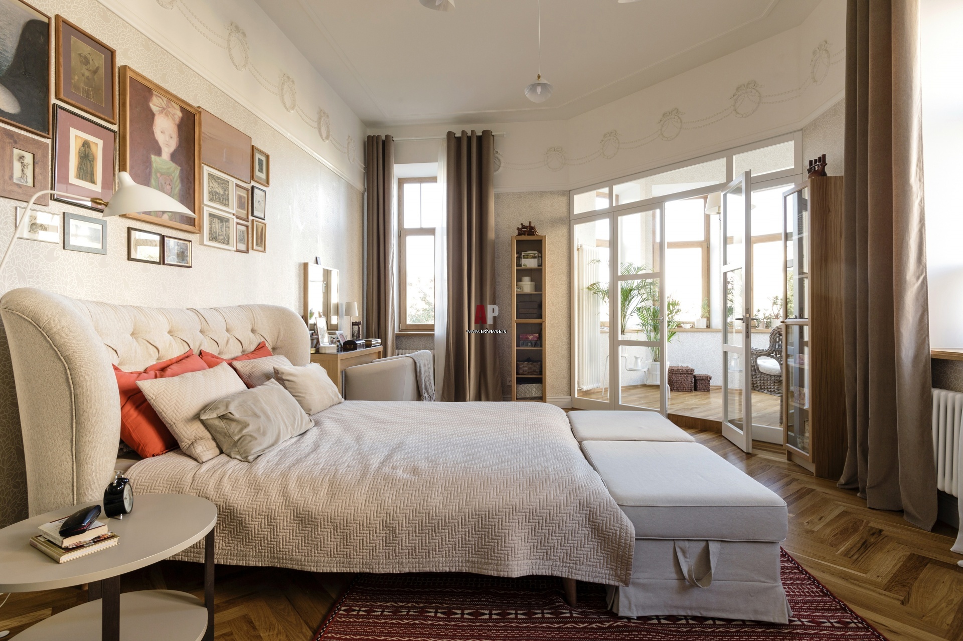 Женская спальня панорамным эркером оформлена в элегантном стиле и теплой цветовой гамме. В эркере обустроен зимний сад. Люстра, торшер, Serge Mouille. Изысканный лепной декор с виньетками – исторический.