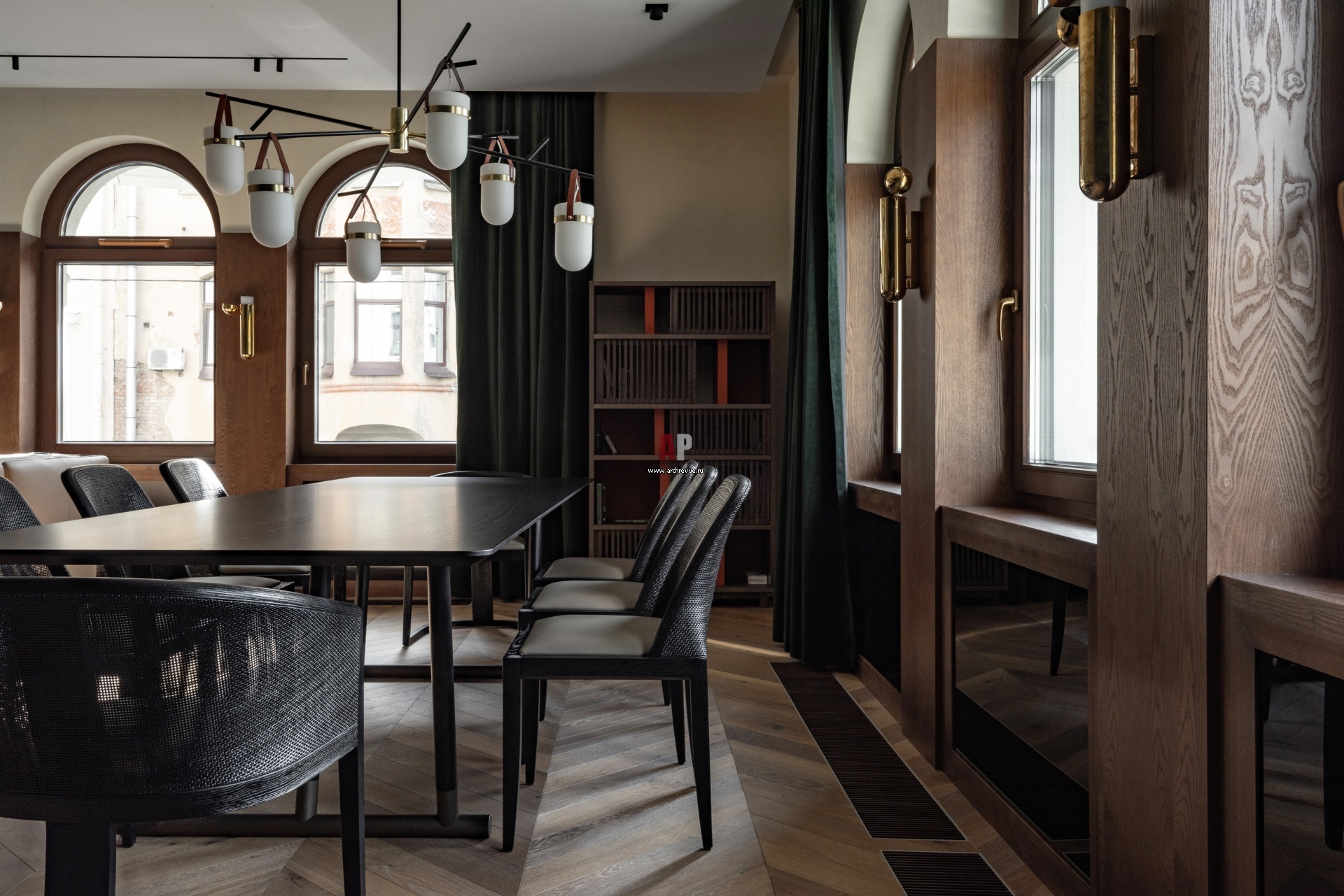 Дизайнеры облагородили оконные рамы: покрыли сосну специальным полимерным покрытием, изменив оттенок на темный, изготовили обрамление и псевдо-пилястры из натурального итальянского шпона.