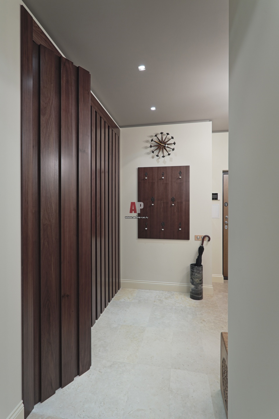 Из прихожей коридор ведет в зону приватных помещений. На полу «мокрых зон» – мрамор бежево-охристого оттенка.