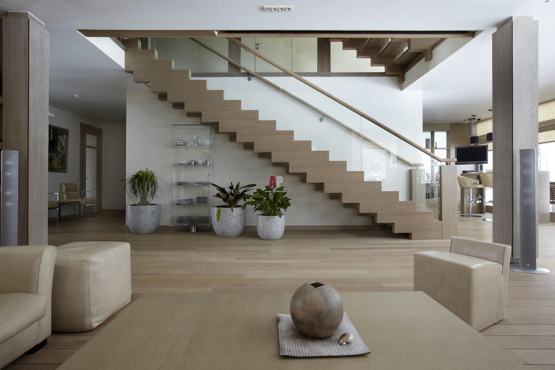Гостиная с лестничным холлом. На полу жилых помещений – широкая массивная доска из беленого дуба.
