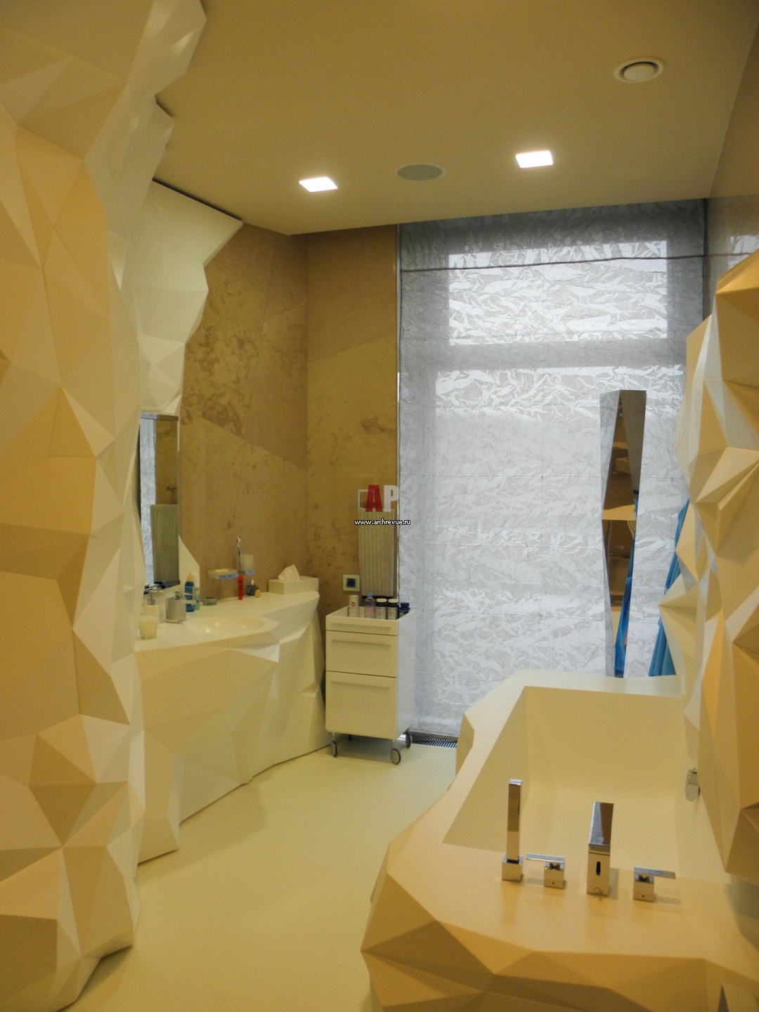 Интерьер ванной комнаты при спальне ребенка-подростка. Стены и полы облицованы мрамором Crema Marfil. Ванна, раковина и скульптурные панели из белого кориана.