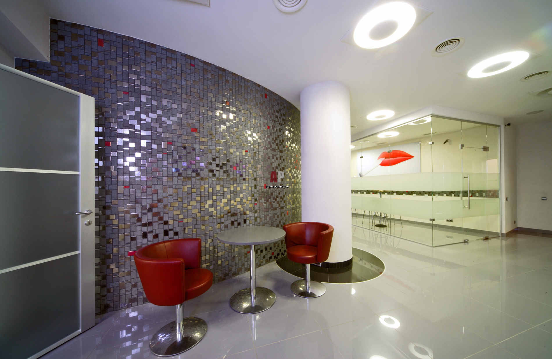 Входная зона акцентирована полукруглой стеной (за ней находятся санузлы), облицованной мозаикой.