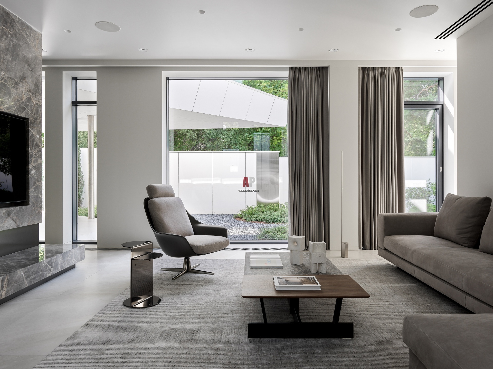 Архитектура и интерьер дома в стиле минимализм в Подмосковье. Общая гостиная первого этажа.