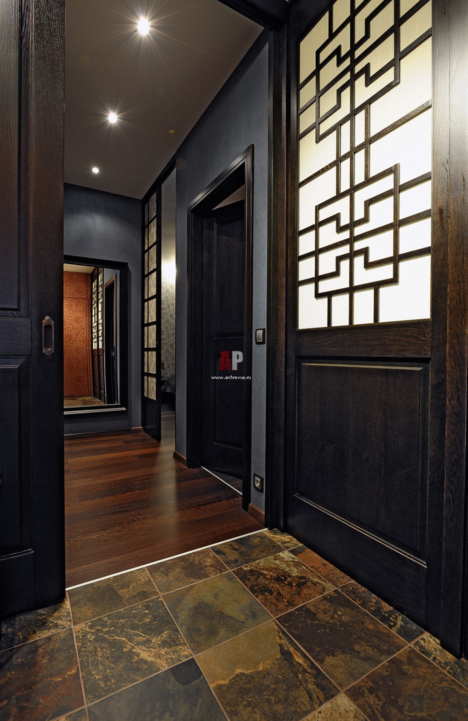 Фото интерьера коридора в этническом интерьере. Перегородки из темного дерева и матового стекла с геометрическим узором.