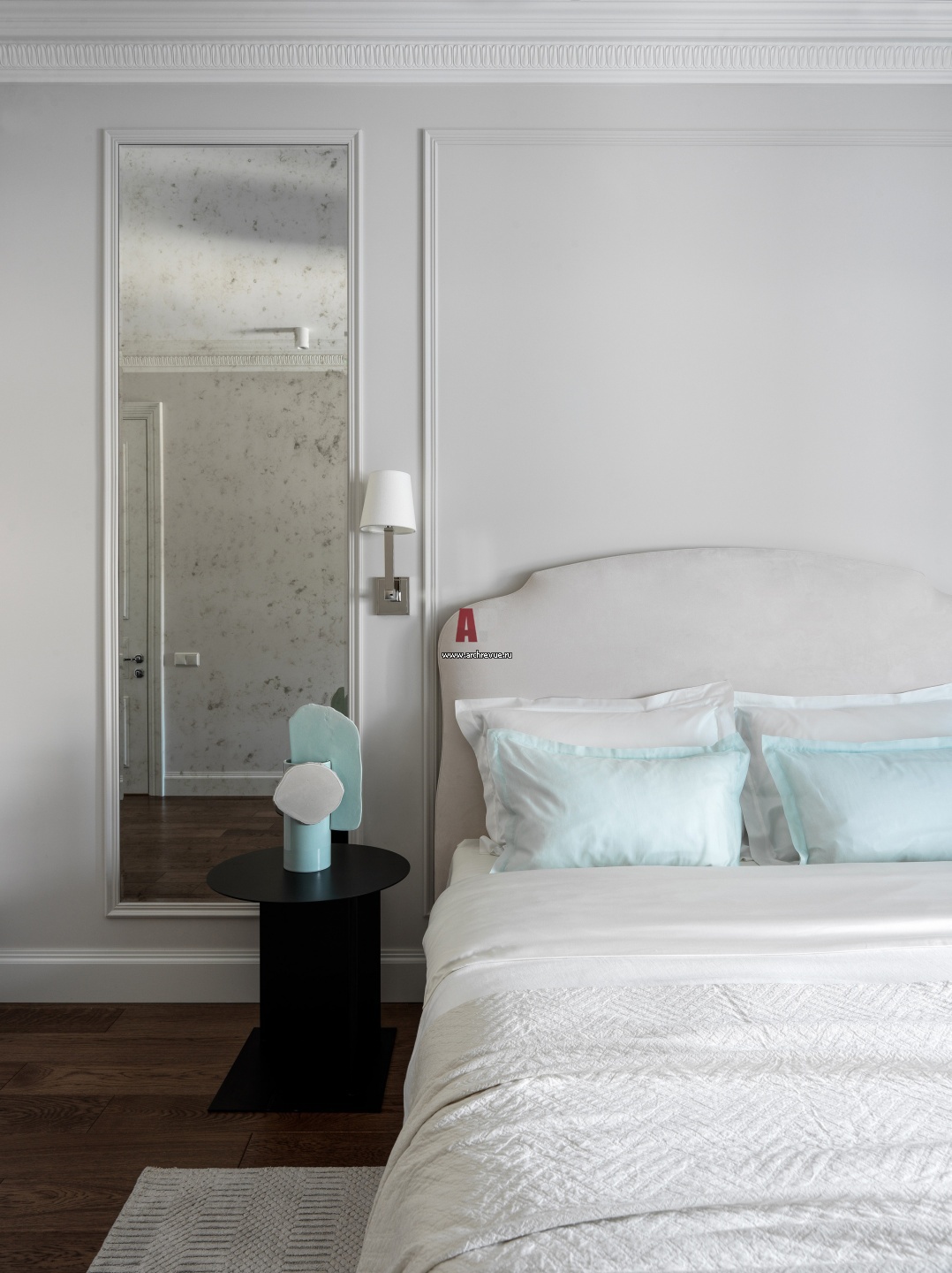 Состаренные зеркала по бокам от изголовья кровати в детской добавляют света и визуально увеличивают площадь. Прикроватный столик, Ferm Living. Бра, Visual Comfort & Co, модель Square.