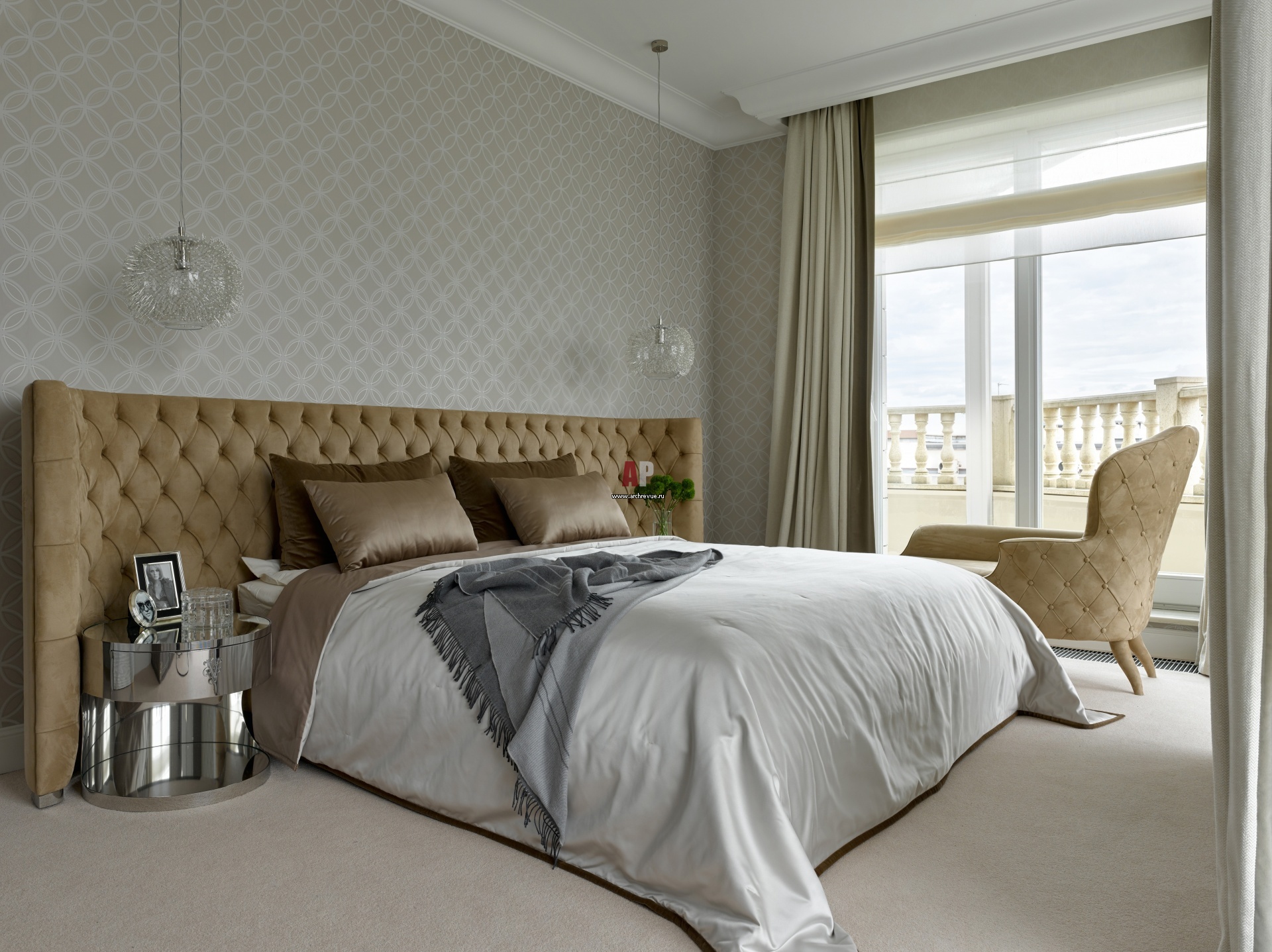Хозяйская спальня выполнена в мягкой, обволакивающей серо-бежевой цветовой гамме. На стенах – обои с геометрическим орнаментом. Кровать с массивным изголовьем, декорированным прошивкой-капитоне, Visionnaire. Светильники, Terzani.
